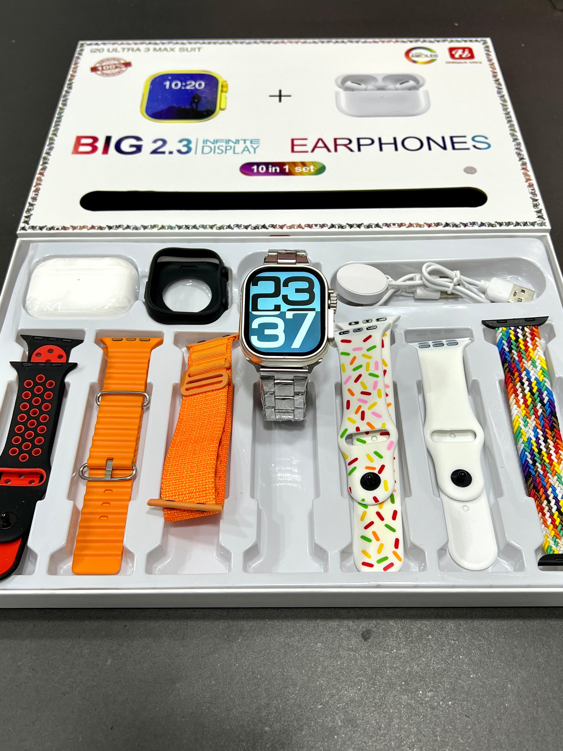 Introducing the I20 Ultra Max Suit 10 in 1 – an all-encompassing smartwatch package designed to elevate your daily life. Packed with essential features and accessories, this suite ensures you have everything you need for a comprehensive and connected experience.